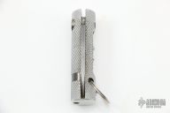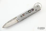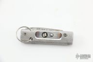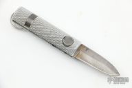 This Side Opening Auto by TenMil bears his maker mark, a cross in a triangle. Has a satin finished blade. The handle is knurled aluminum. Push the button to fire, safety below the button. The butt of the knife holds a gravity deployed spike, slide the steel tab up and the spike slides out. Cool vintage knife. Has scratches, has some oxidation on the blade, otherwise good condition. #0004