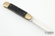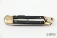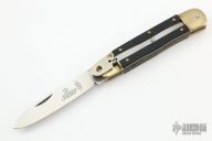 This leverlock auto by Hubertus features a mirror polished blade, nickel silver double bolsters, ebony scales, nickel silver liners and brass pins. Opens with a nice snap. Very fast opening. Has some patina and light scratches, otherwise good condition.