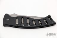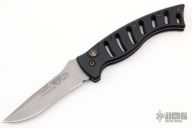 This Paragon X-O Lite auto has a blasted recurve blade with notched thumbrest and false top edge. Handle is black anodized aluminum with a push button. Has some scuffs/scratches/patina, otherwise good condition.