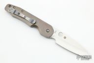 This Smock by Spyderco has a satin finish sheepsfoot style blade. The handle features carbon fiber scales over stainless steel liners with a reversible stainless steel pocket tip up pocket clip. Comes with original box and papers. Excellent condition. Bronze Titanium Smock Scales.