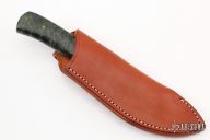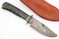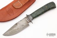 This Pocket Bowie by Dave Armour features a Cable Damascus blade with false top edge, .284" blade stock and 1.511" blade depth, hidden tang construction. The handle has a blued steel guard with a stabilized box elder burl wood grip. Comes with a black leather sheath and COA. Excellent condition.