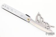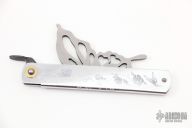 This Higonokami features a friction folder style blade and a stainless steel handle. Brass pivot collars. Comes with original box and papers. Blade Steel: HITACHI YASUKI AOGAMI/ Blue Steel. Excellent condition.