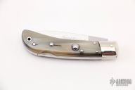 This Speed Hunter by AKC Italy has a polished blade, high polish nickel silver bolsters, and honey horn scales, stainless steel liners and backspacer. Slide safety switch. Excellent condition. Comes with a brown leather belt sheath.