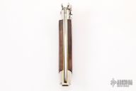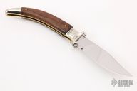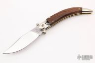 This Sahara lockback auto by AGA Campolin features a mirror polished blade, mirror polished nickle silver bolsters and cocobolo wood scales, brass liners. Nice function, strong firing and lock up. Excellent condition. Comes with brown leather sheath. Has 16 and 12 gauge shotgun shell puller bolsters.