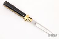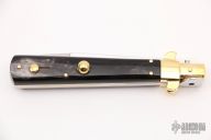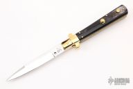 This 10" Picklock Auto by Renzo Pascotto has a polished stainless steel spear point blade with false top edge. Handle is buffalo horn with brass bolsters, brass liners, brass pins, stainless steel back spacer, and safety. Comes with a leather slip sheath and a zippered case. Excellent condition.