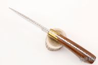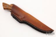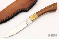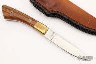 This hunter by Tom McLuin features a satin finished blade that has filework on spine and tang, .138" blade stock and .807" blade depth, full tang construction. The handle has brass dovetailed bolsters, wood scales with mosaic pins. Comes with a brown leather sheath. "85 D2" on ricasso. Has some patina, otherwise excellent condition.