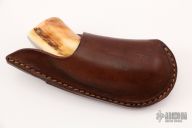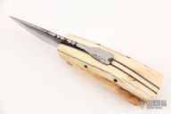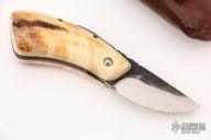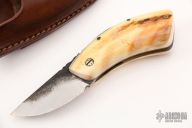 This friction folder features a forged blade with satin bevels and a fileworked spine. The handle has warthog tusk scales with brass liners and a warthog tusk backspacer. Comes with a brown leather sheath. Has a little patina, otherwise excellent condition.