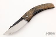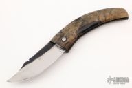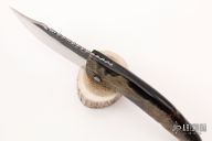 This friction folder features a forged blade with a fileworked spine. The handle is a single piece of sheep horn. Excellent condition. Marked "G" on the blade, please let us know if you know who this is.