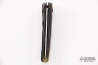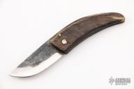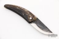 This friction folder by Fabien Cazorla features a forged blade. The handle is a single piece of sheep horn. Has some scratches, otherwise good condition.