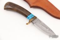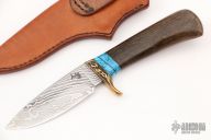 This Drop Point Hunter by Master Smith Audra Draper features a Damascus blade with .134" blade stock and 1.171" blade depth, hidden tang construction. The handle has an engraved brass guard, sheep horn grip with black and turquoise spacers. Comes with a brown leather sheath and zippered case. Audra Draper was the first female Master Smith.