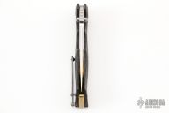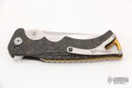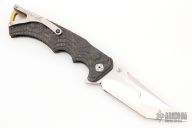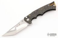 This Tighe Fighter Flipper by Brian Tighe features a polished and tumble finished multi-ground tanto San Mai blade with notched thumbrest, S90V core with CPM154CM cladding. The handle has milled carbon fiber scales, sculpted and anodized backspacer and a tip up titanium clip with ceramic ball, lanyard hole at the butt. Comes with nylon zippered case. Nice action, lockup and blade seating. Comes with a zipper case. Excellent condition.