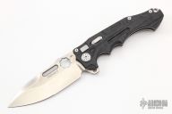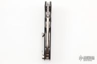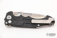 This Pitboss 2 by Andre De Villiers features a drop point blade with thumbhole, notched thumbrest and flipper. It swings smoothly on a ball-bearing system and has both a thumb hole and flipper opener; it can also be opened or closed with a flick of the wrist when the inlaid button lock is held down. A safety switch on the side allows the blade to be locked in the closed position or provides an additional level of safety in the open position. It has a milled carbon fiber handle with satin hardware. A jimped, titanium backstrap with a lanyard hole and a tip-up, black, titanium pocket clip with hidden screws. "24-2020" on the ricasso. Comes with a zippered case. Has some light scuffs on the clip, and there is some marring on the hardware. Otherwise excellent condition.
