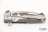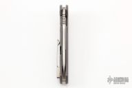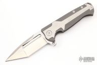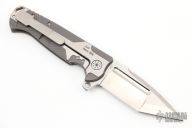 This ADV Ronin framelock flipper has a stain polished finished spear point tanto blade with notched flipper and thumbrest. Handle has a two-tone finished titanium frame, anodized titanium hardware and titanium backspacer with mokuti inlay, tip up anodized titanium spring clip with mokuti mount. Has stainless steel lockbar insert and lockbar stabilizer. Nice smooth action, detent, lockup and blade seating. Comes with a nylon zippered case. Has light scratches, otherwise excellent condition.