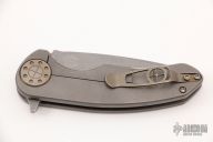 This F3 Medium by Curtiss Knives features a stonewashed blade with notched thumbrest and flipper. The handle has a tumbled titanium frame with a tip up titanium clip. Rides on bearings, nice detent and lockup.  Comes with original zipper case and card. Excellent condition.