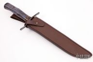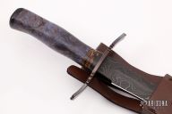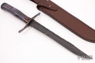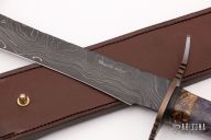 This custom fixed blade from Barry Dawson features a Damascus blade with fileworked spine and false top edge, .183" blade stock and 1.375" blade depth, hidden tang construction. The handle has an anodized titanium guard, dyed and stabilized maple burl grip with marble carbon fiber butt, marble carbon fiber and stabilized cross cut mammoth ivory spacers. Includes a brown leather sheath. Excellent condition.