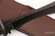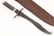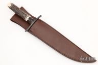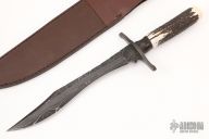This custom fixed blade from Barry Dawson features a Damascus blade with fileworked spine and false top edge, .185" blade stock and 1.573" blade depth, hidden tang construction. The handle has a Damascus guard, stag grip with mammoth ivory butt, kudu horn spacer. Includes a brown leather sheath and a zippered case. Excellent condition.