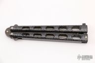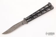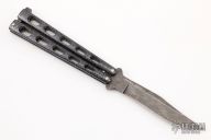 This Balisong by Bear MGC features a Damascus blade. The handles are black/grey coated with matching T-latch. Has a little patina on the blade, otherwise good condition.