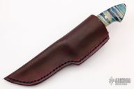 This drop point hunter by Phillip M Parris features a mirror polished blade with .150" blade stock and 1.130" blade depth, full tapered tang construction. The handle has a nickel silver guard, mammoth tooth scales with mosaic pins and red liners. Comes with a leather sheath. New from maker.