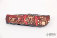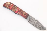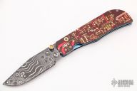 This linerlock by Jake Elenbaas features an Alabama Damascus blade with single thumbstud. The handle has mother board scales, anodized titanium liners and a black G-10 backspacer. Comes with COA. New from maker.