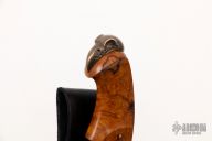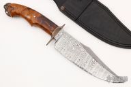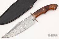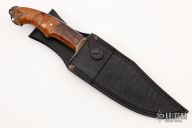 This knife by Jan Hafinec features a clip point Damascus blade with a sharpened top edge, .240" blade stock and 2.022" blade depth, hidden tang construction. The handle has an antiqued bronze guard with a nicely sculpted desert ironwood burl grip, has a bronze raven skull at the butt for a lanyard hole. Comes with a black leather sheath. New from maker! Extremely well done! Comes with a zippered case.