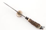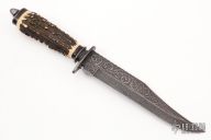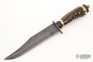 This beautiful bowie by Lee Berg features a clip point cable Damascus blade with Ghost etched floral design on both sides, fileworked spine, .197" blade stock and 1.388" blade depth, hidden tang construction. The handle has a Damascus guard and butt, fluted Damascus and wood spacers, stag grip, polished steel acorn finial. Coems with a zippered case. Has a little oxidation on the tang nut, otherwise excellent condition. Lee Berg is an amazing knife maker.