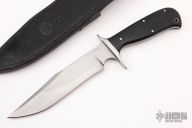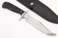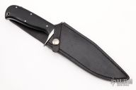 This Fighter by Journeyman Smith Rob Patton features a hand rub satin finished blade with a hamon and false top edge, .197" blade stock and 1.415" blade depth, full tang construction. The handle has a stainless steel guard and black G-10 scales. Comes with a black leather sheath and a zippered case. Has some scratches, otherwise excellent condition.