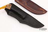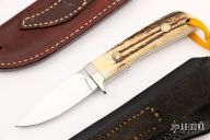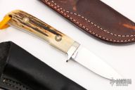 This Hunter by Seizo Imai features a mirror polished drop point blade with .144" blade stock and .831" blade depth, full tapered tang construction. The handle is comprised of a nickel silver guard and stag scales. Includes brown and a black leather sheaths. Has a few light scratches, otherwise excellent condition.