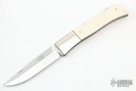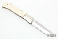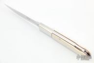 This Lockback folder by Frank Centofante features a hand rub satin finished drop point blade with nail nick. The handle has nickel silver bolsters and liners, pre-ban ivory scales, stainless steel lockbar and black linen micarta backspacer. Has some light scratches, has a crack in the scales on both sides on the same pin , otherwise excellent condition. Comes with a felt pouch.