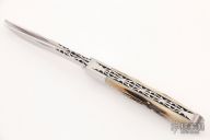 This Two-Blade Trapper by Bill Ruple features hand rub satin finished blades with nail nicks and fileworked spines that match up perfectly. The handle has mirror finished stainless steel bolsters, stag covers, fileworked stainless steel liners and springs. Outstanding filework.  Half-Stop flush in all positions. Comes with a zippered case.  Excellent Condition.