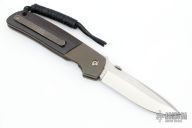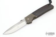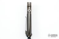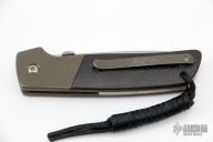 This ATCF from Bob Terzuola features a lightly tumbled drop point blade with swedge, thumb disc and notched thumbramp. The handle is comprised of anodized titanium bolsters and liners, carbon fiber scales and an anodized and eggshell finished titanium backspacer, tip up titanium clip. Lanyard hole in pommel. Has some scuffs, otherwise excellent condition. Comes with a zippered case.