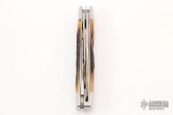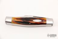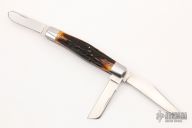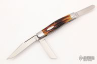 This 3-Blade Stockman by Bill Ruple features three hand rub satin finished blades with nail nicks. The handle has pinched stainless steel bolsters, stag covers with a stainless steel shield escutcheon, stainless steel liners and springs. Has half stops, flush in all positions. Comes with a zippered case. Excellent Condition.