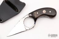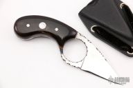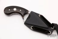 This custom version of Fred Perrin's popular La Griffe features a mirror polished blade with fileworked spine and finger hole, buffalo horn scales with blue liners and mother of pearl inlays, full tang construction, .121" blade thickness and 1.250" blade depth. Nice fit in the hand. Includes kydex neck sheath. Has some light scratches, otherwise excellent condition.