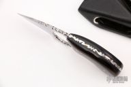 Fred Perrin makes fixed blades and folders of every kind; Forges Damascus steel or uses stock removal techniques. In any case, he always does his own heat treatment and tempering. As far as his background in the martial arts, Fred has spent two years in the French Army Commandos and worked as a bodyguard. He was a national Tae Kwon Do champion and a European full contact stick-fighting champion. He has trained in Kali, and God knows what else. His weapon of choice is the butterfly knife, in which he excels. Aside from being France’s most famous and controversial knife maker and tactical writer, Fred runs a school where he teaches a very unique blend of knife, stick, and empty hand techniques. He is often contracted by France’s elite police units for seminars. He also provides some agencies with custom-made weapons for ballistic testing.