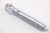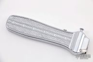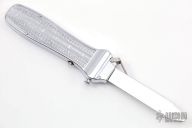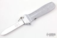 This vintage OTF by Bonsa features a mirror polished flat ground blade. The handle is chrome plated stainless steel with a trap door covering the blade. This knife has a safety. Has some light scratches, otherwise excellent condition.