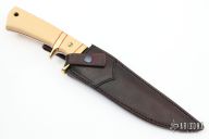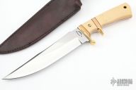 This Sub-Hilt Fighter from Ricardo Perpina features a satin finish clip point blade with a sharpened top edge, notched thumbrest and a full tapered tang, .244" blade stock and 1.606" blade depth.  The handle has a brass guard and sub-hilt with ivory paper micarta scales and red liners, brass and mosaic pins. Comes with a brown leather sheath. New from maker.