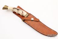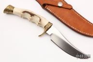 This is a vintage non-dot skinner made by Jimmy Lile and features a stag handle with an engraved brass guard and butt. Engraving done by J. Compton. Satin finished blade with false top edge, .186" blade stock and 1.241" blade depth, hidden tang construction. Includes a brown leather sheath. Excellent condition.