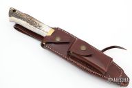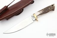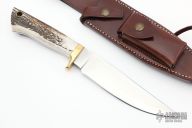 This Hunter from Ricardo Perpina features a satin finish blade with .198" blade stock and 1.292" blade depth, full tang construction. The handle has a brass guard with stag scales with brass pins. Coems with a brown  leather sheath with sharpening stone. New from maker.