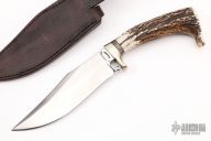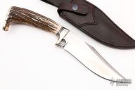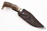 This Personal Bowie from Ricardo Perpina features a satin finish blade with a sharpened top edge, .230" blade stock and 1.573" blade depth, hidden tang construction. The blade has a fancy carved ricasso. The handle has a nickel silver guard and butt with stag grip, black and nickel silver spacers. Comes with a black leather sheath. New from maker.