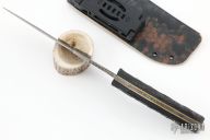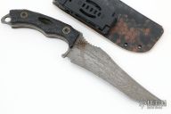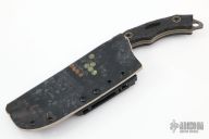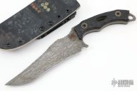 This Necromancer Prototype #3 of 3 by Kraken Tactical features a laser engraved blade with notched thumbrest and sharpened top edge, .107" blade stock and 1.589" blade depth, full tang construction. The handle has black laser engraved scales with brass liners and screw collars, lanyard hole at the butt. Comes with a kydex sheath with clip and original box. New from maker.