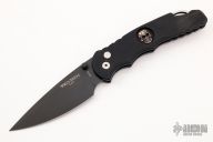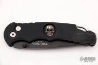 This Protech Manual Action Skull features a DLC blade and a sterling silver skull designed by Bruce Shaw inlaid in the black aluminum handle. Satin stainless steel clip. Stainless steel push button. Serial number #390/500. Comes with original box and sheath. Has some light scuffs and scratches, great condition otherwise.