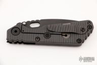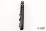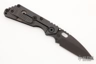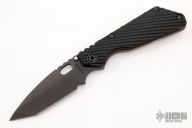 This Mick Strider SNG framelock folder features a black blade with thumbhole and notched thumbrest. The handle has a black G-10 and flamed titanium frame with titanium clip, tip up carry. Jimping on blade spine. The G-10 has a diagonal groove pattern. Nice lockup, detent, and blade seating. Has some light scuffs otherwise excellent condition.