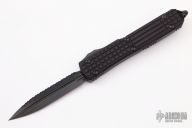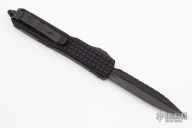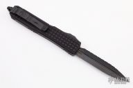This Ultratech OTF automatic by Microtech features a D/E black DLC fluted blade. Black aluminum frag pattern frame with black tip down stainless steel clip. Dated 10/2021 and s/n 072. Excellent condition. Includes original box and papers.