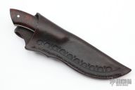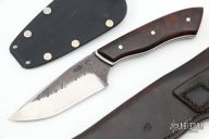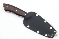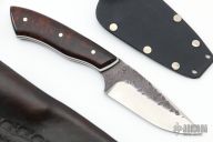 This  neck knife features a hitachi white #1 steel core laminated with 410 stainless steel drop point blade with a full tang construction.  .129" Blade Stock.  1.27" Blade Depth.  The handle features desert ironwood scales over white/black liners.  Includes a kydex neck sheath and a leather sheath.  Excellent Condition.