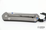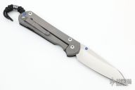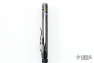 This large Sebenza 21 features a tumble finish sheepsfoot blade and a bead blast titanium and carbon fiber frame. Bead blast titanium clip, tip up carry. Has blue thumbstud and barrel spacer. Comes with original box and papers. March 26, 2013. Excellent condition.