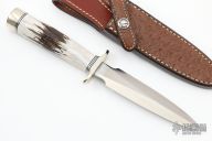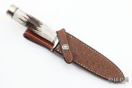 This Model 2-5 by Randall Made Knives features a satin finished double edged stainless steel blade, .154" blade stock and 1.075" blade depth, hidden tang construction. The handle has a nickel silver guard and butt, stag grip and black/duralumin spacers. Comes with a brown leather sheath with ostrich skin overlay by Sullivans. Excellent condition.