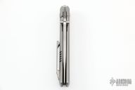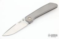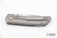 This Mula framelock by Enrique Pena features a hand rub satin finished drop point blade with swedge, notched thumbrest and dual thumbstuds. The handle has a bead blasted titanium frame with a titanium backspacer. Matching tip up titanium clip. Comes with original box.  Has some very fine, micro, chipping in the blade edge. Excellent Condition otherwise.