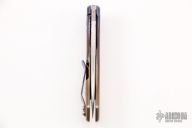This Mini Exo flipper is from Gerry McGinnis' new Pro Line series. Features a stonewashed sheepsfoot style blade with flipper and notched thumbrest. The handle has a stonewashed/anodized titanium frame with matching tip up clip and black G-10 backspacer. Great detent, lockup and blade seating. Comes with a cloth case. Has some scratches, otherwise good condition.