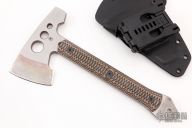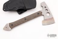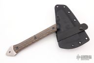 This Wee Ram Tomahawk comes to us directly from Graham Knives and features a stonewashed finish and textured/layered G10 scales. This piece is made of 1/4" A2 tool steel. Included is a Buy Brown kydex sheath with Tek Lok. Has a couple light scuffs, otherwise excellent condition.