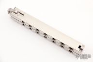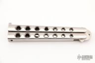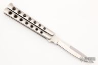 This Model 129 International Series Balisong by Pacific Cutlery has a satin finished stainless steel blade with false top edge (marked 1985). Handle is satin finished stainless steel with skeletonized handle. Has some light scuffs and scratches otherwise great condition.