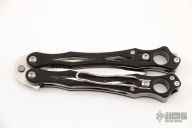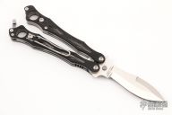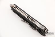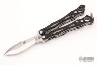 This B02 Smallfly from Spyderco features a satin finished spear point blade with false top edge. The handle has black G-10 scales, stainless liners, aluminum spacers, and a spring latch. Excellent condition.